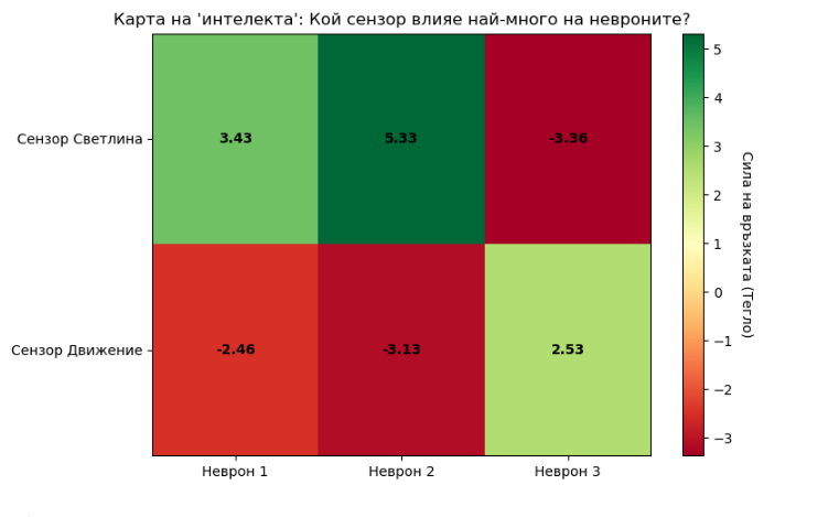 - Скрит слой (3 неврона): Това е "черната кутия", където мрежата прави връзки между светлината и движението. Три неврона са напълно достатъчни за тази логика.