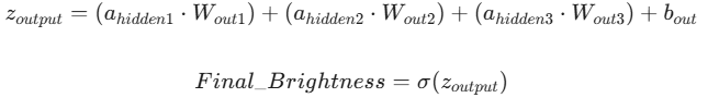 - Изходен слой (1 неврон): Крайният резултат — число между 0 и 1, което определя яркостта на нашия LED.