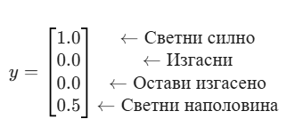 - Вектор y (Малка буква): Представя нашия желан изход (таргет). Използваме малка буква, защото това е прост списък от стойности – в нашия случай, колко силно да свети лампата.