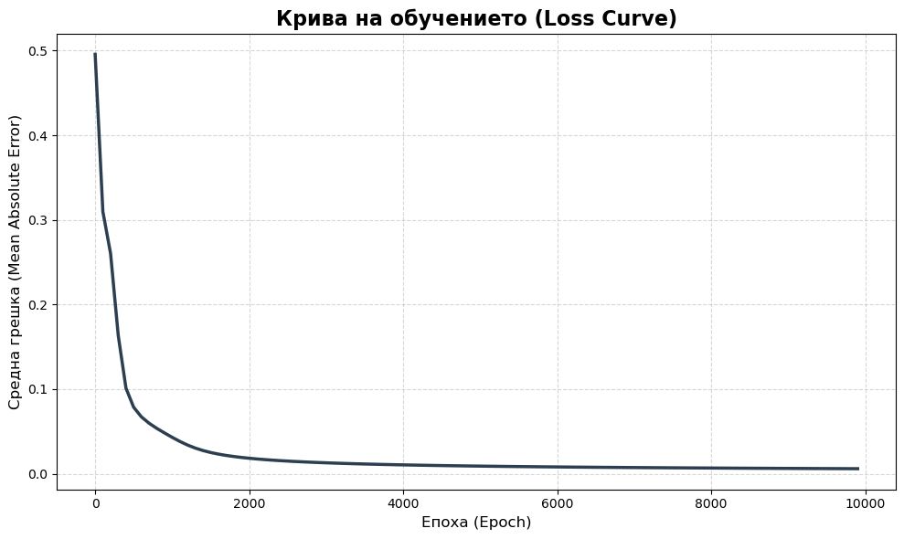 Както се вижда от генерираната Loss Curve (Крива на загубите), мрежата прави най-големите си корекции в първите няколкостотин епохи. Тогава градиентът е най-стръмен и MAE намалява прогресивно. След епоха ~2000 кривата асимптотично се доближава до нулата, което е сигнал, че сме извлекли оптималните тегла (weights) за нашите неврони.